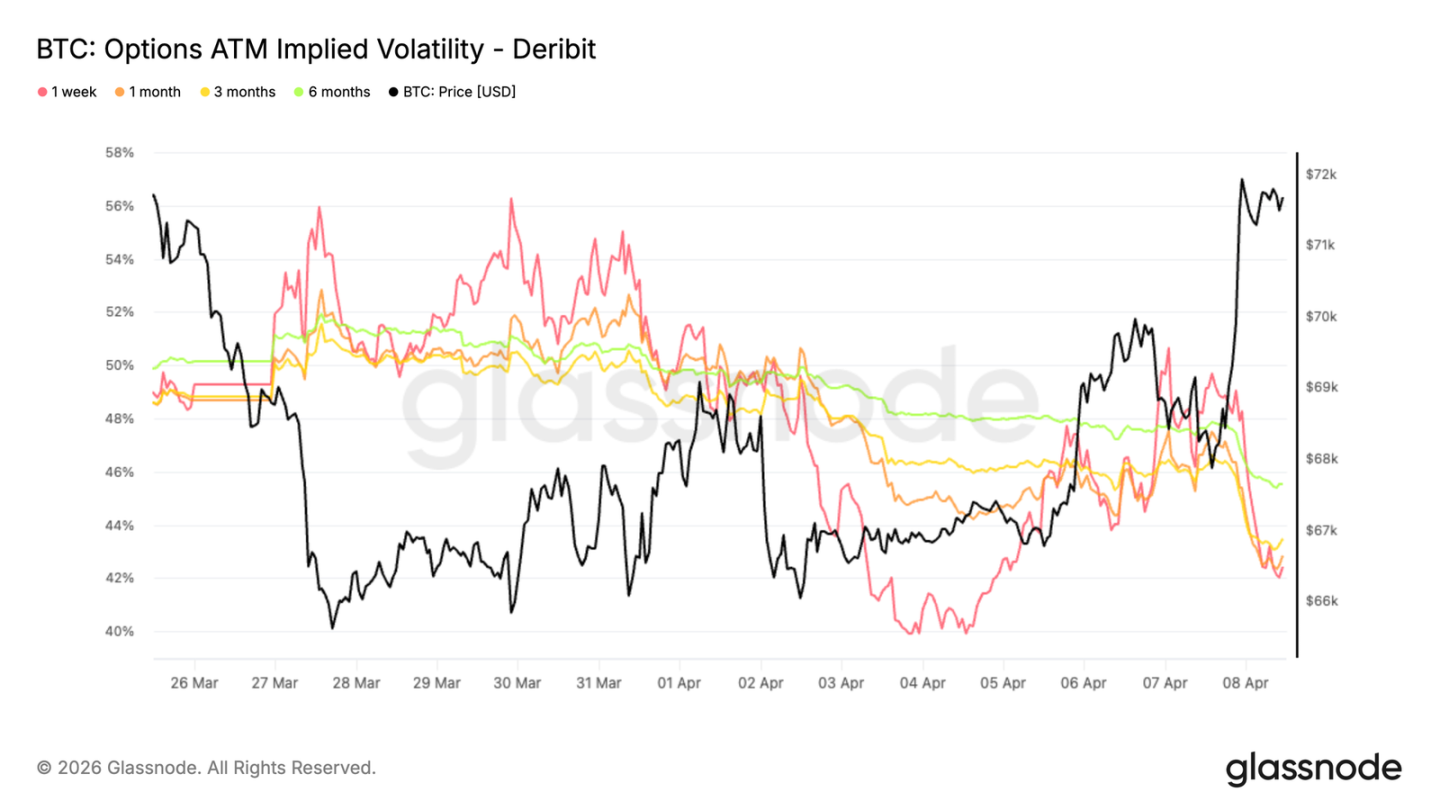 美伊停火加速波动率回落:比特币反弹至 72000 美元,但现货疲弱与期货萎缩仍拖累复苏。