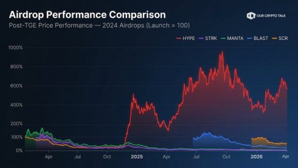 依 2024 年行业惯例推断,此举本应酿成一场灾难。当年主流空投项目均遵循同一模式:风险投资机构占据两成以上份额,社区仅获约半成,代币发行后随即遭抛售。Scroll、Blast、Starknet、Manta 等无不如此,代币生成事件后均见证大规模资金外流。加密推特上的普遍共识认为,贪婪的机构份额分配已葬送了空投模式。