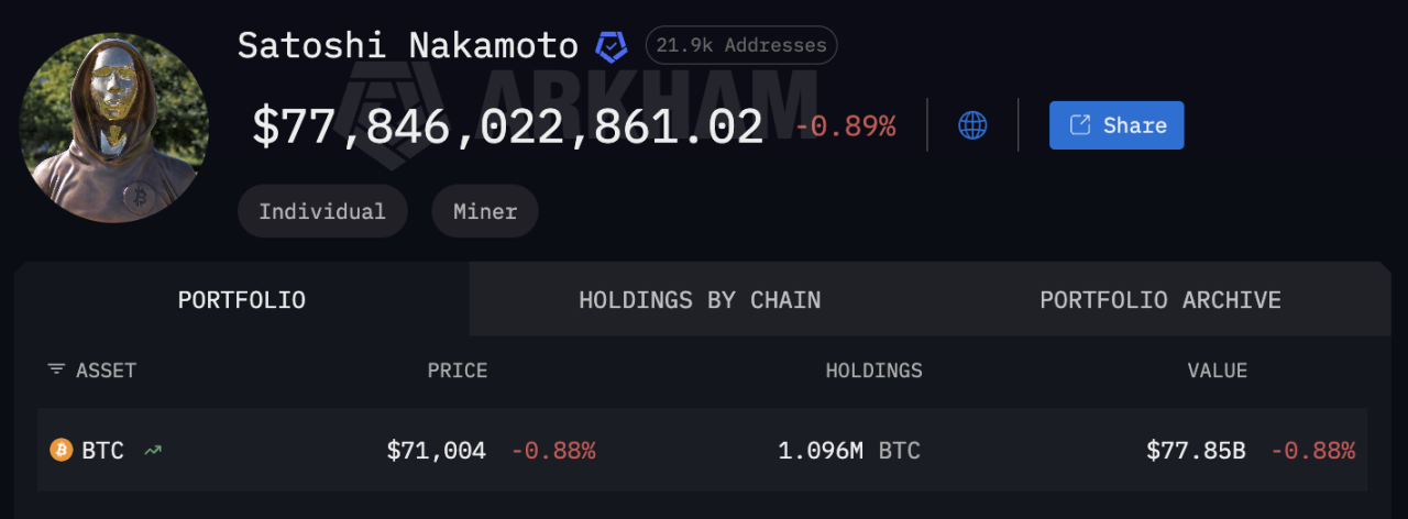 匿名身份为中本聪增添了持续至今的神秘色彩,而其约 110 万枚 BTC(约合 770 亿美元)持仓的潜在归属与动向,也始终牵动着市场神经。