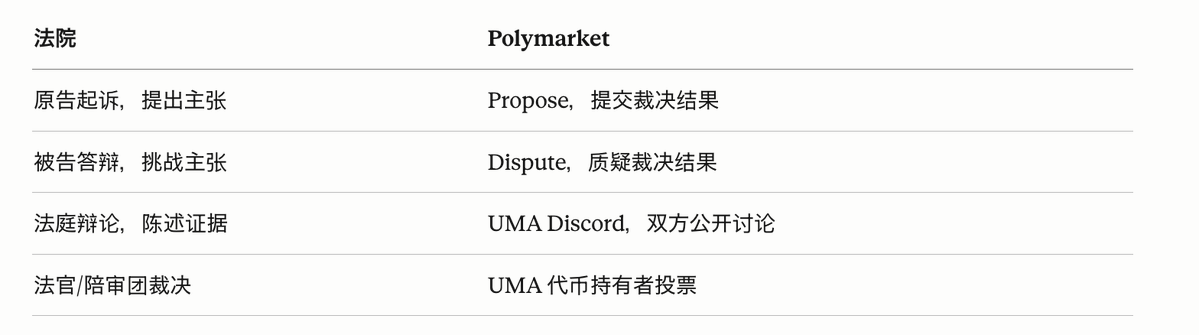 表面上看,Polymarket 的裁决流程和传统法院高度相似:都有提出主张的一方,都有挑战主张的一方,都有讨论陈述的环节,最后都有一个裁决者给出结果。
